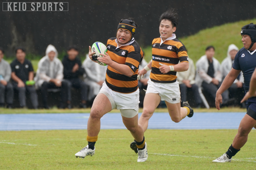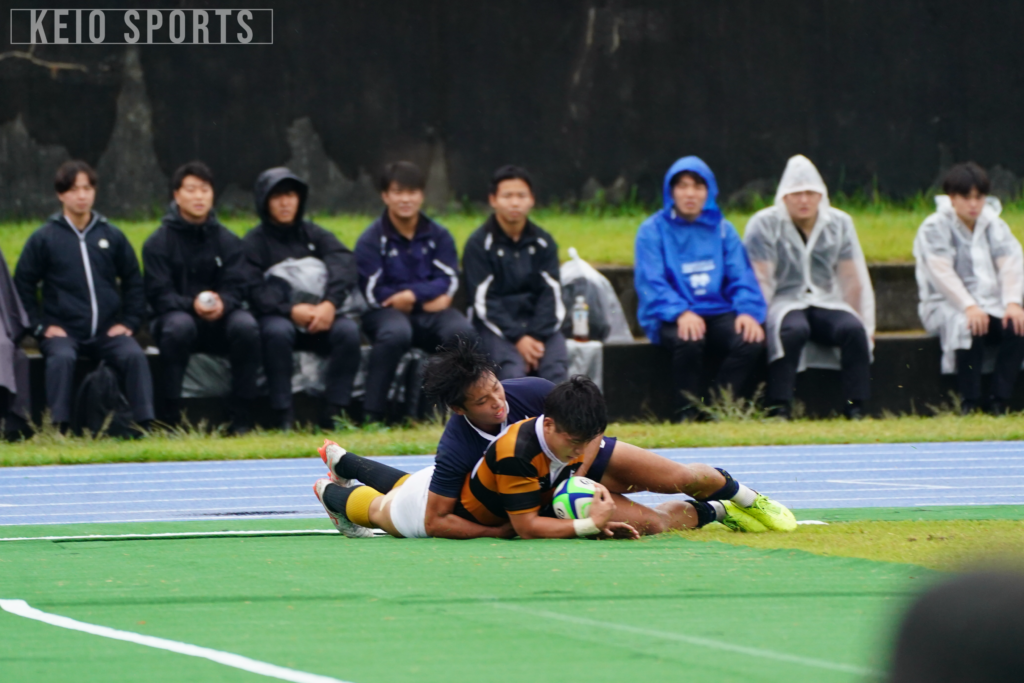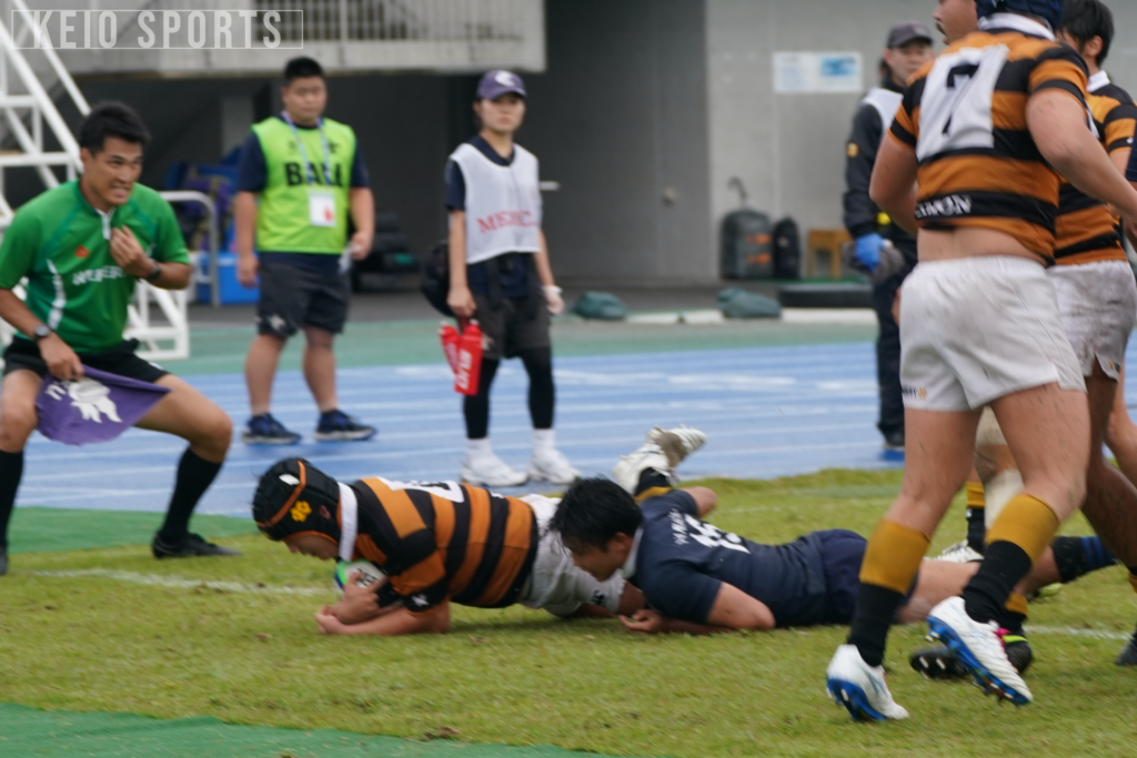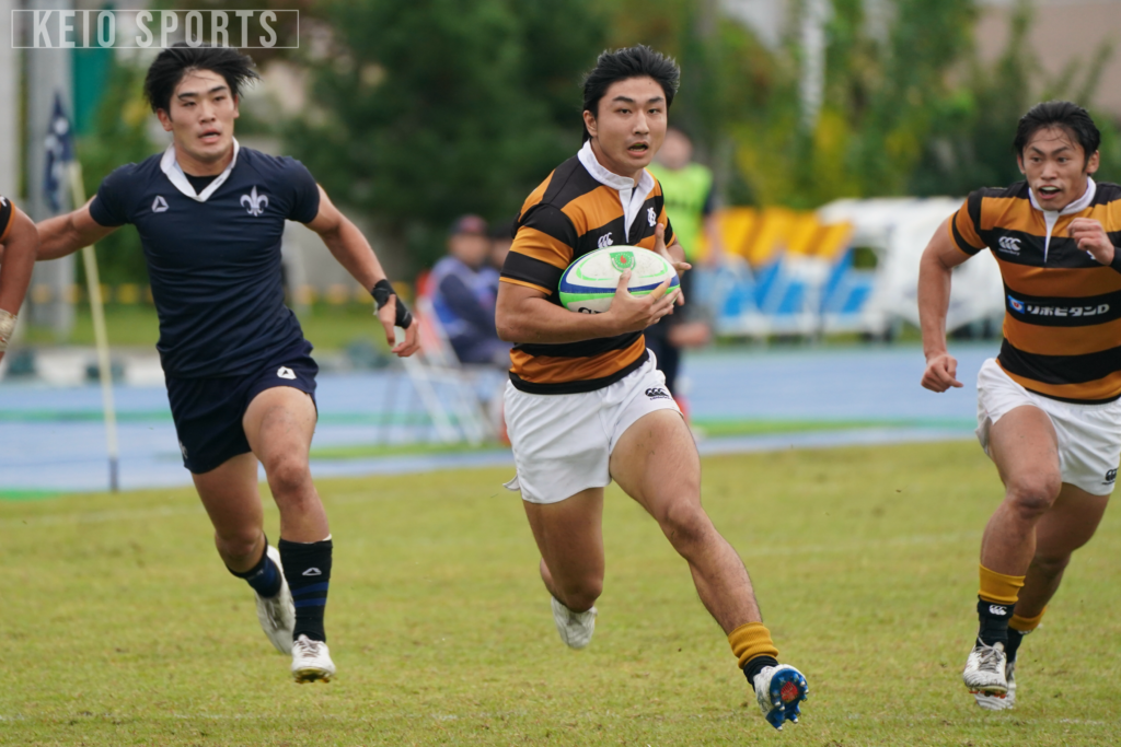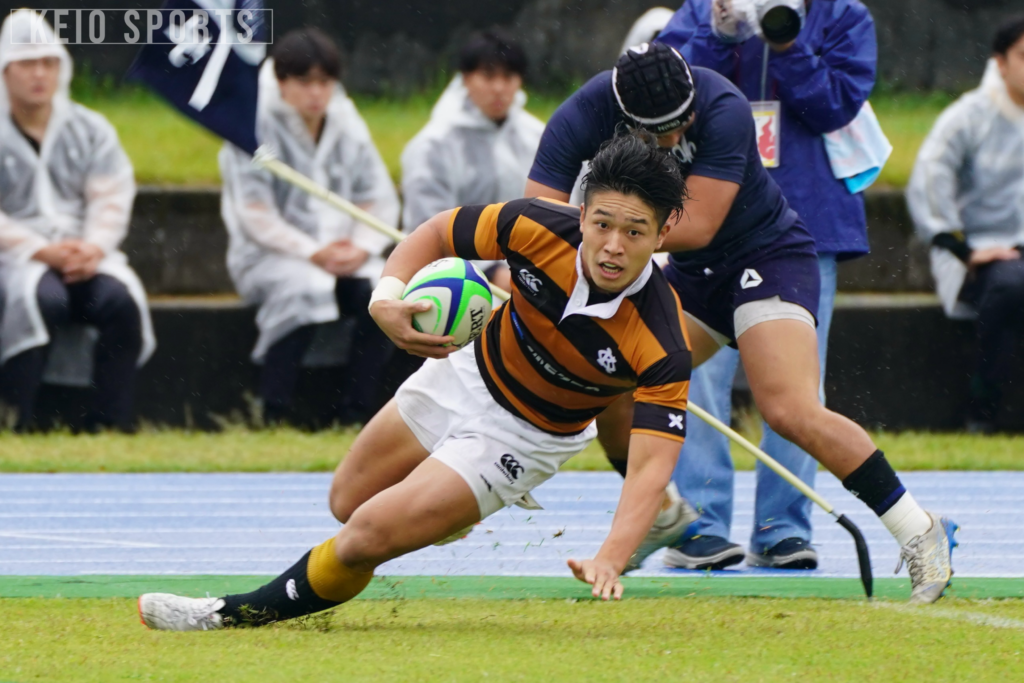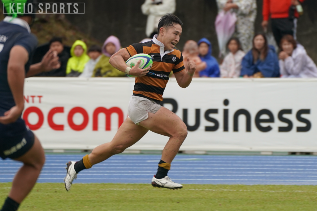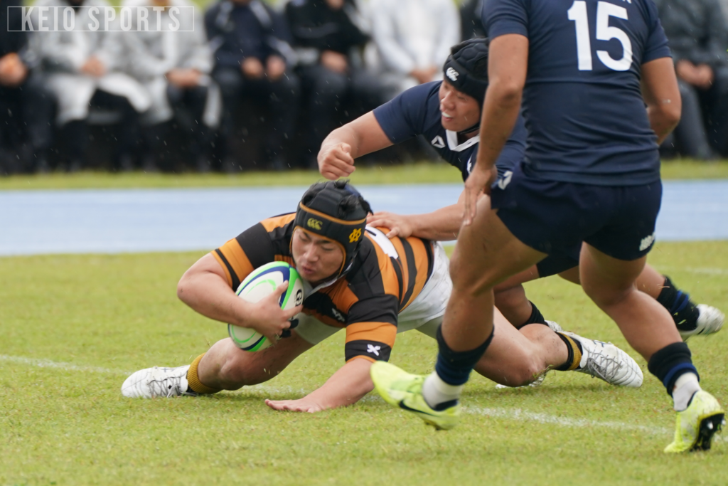 渥美は11分にもハーフウェイライン付近からギャップを突いて抜け出すと、30m超のロングゲインで連続トライを決めた。20分を終了した時点で、スコアは17-0。この日の慶大は終始、試合を優位に進めていた。ディフェンスでもFLの好タックルやSH橋本のキックチャージ成功と、好プレーが飛び出し、鉄壁のディフェンスを魅せていた。