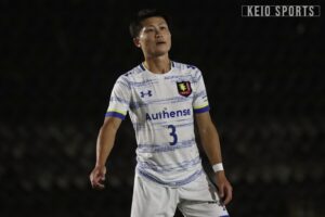 前節・日体大戦で後期初勝利を掴み流れに乗る慶大は、4試合ぶりにトップ下で藤井漱介(商3・静岡学園)をスタメン起用。今シーズン初の連勝を目指して第18節・桐蔭横浜大戦に臨んだ。序盤から慶大は積極的にボールを握り、ゴール前でチャンスを多く作る。相手のカウンターをしのぎつつ迎えた33分、角田惠風(商4・慶應/横浜F・マリノスユース)のコーナーキックに斎藤大雅(文3・立命館宇治/京都サンガF.C.U-18)が右足で合わせ先制点を奪う。その後攻め込む場面を作るも追加点を奪えず前半は終了。後半も主導権を握りたい慶大であったが、47分相手コーナーキックの流れから押し込まれ失点、同点に追いつかれる。勝ち越し点を奪いたい慶大は再びボールを握り、攻め込む展開を作るもなかなかゴールには結びつかない。もどかしい展開が続く中83分、ペナルティキックを献上。これを決められ逆転を許す。追いつきたい慶大であったが、斎藤大がこの日2枚目のイエローカードをもらい退場。90+4分にはその穴を突いた相手に追加点を決められ万事休す。1-3での悔しい敗戦となった。