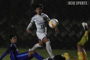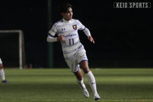 前半33分、角田惠風(商4・慶應/横浜F・マリノスユース)のコーナーキックにファーサイドから斎藤大雅(文3・立命館宇治/京都サンガF.C.U-18)がゴール前へフリーで走り込み、右足で合わせる。ボールはゴール隅に吸い込まれ、先制に成功する。流れをつかんだ慶大は、その後も積極的に攻撃を仕掛ける。44分には、田中のパスを受けた永澤がポケットに侵入し、ダイレクトでシュート。相手GKのジャンピングセーブに阻まれ、惜しくも追加点とはならなかったが、終盤まで主導権を握り続ける。慶大は1−0とリードし、前半を折り返した。