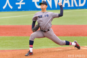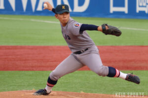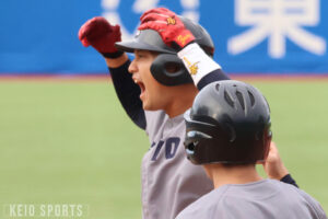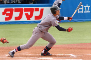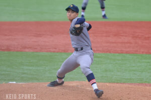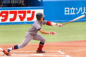 初回の攻撃は2死から今津慶介(総3・旭川東)が左翼手のグラブを弾く三塁打を放つも、常松広太郎(政4・慶應湘南藤沢)が内角高めの直球を詰まらせ、捕邪飛。3回には先頭打者の8番・上田が遊安打をヘッドスライディングでもぎ取ると、小川琳が三塁線際へ絶妙な犠打を決め1死二塁。しかし、1番・丸田湊斗(法2・慶應)が放った左翼への大飛球は寺尾の好守に阻まれると、続く渡辺憩は見逃し三振に倒れ、得点圏を活かすことができない。