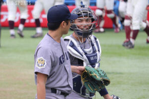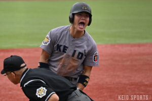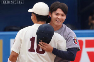 しかし最終9回の攻撃で、ワセダの守護神・田和に対して1死から加藤が中安打を放つが、今泉が二飛で2死。そして続く八木はカウント2-2から外角低めの変化球にバットが空を切り、空振り三振で試合終了。慶大はワセダの7安打に迫る6安打も、好機であと一本が出なかった。