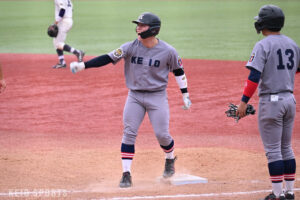 優勝に向け後がなくなった9回。慶大は先頭打者に代打・安達英輝(商2・慶應)を起用。明大3番手・渡邉聡之介(政経2・浦和学院)から左安を放ち、同点の走者を一塁に置く。代走・北川昂政(総2・広島新庄)は捕逸で二塁へ進塁、続く渡邉千は投手強襲の内野安打で無死一、三塁と絶好の好機を演出。すると1死から今大会主将を務める服部が右前適時打を放ち、土壇場で4ー4と試合を振り出しに戻す。