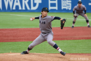 しかし4回、1死から明大・中野竣介(法2・桐蔭学園)に甘く入った直球を弾丸ライナーで左翼席に運ばれ、1ー1と追いつかれる。次打者にも死球を与えたところで入江にスイッチ。安打と四球で満塁とされ、延末藍太(商2・慶應)の好守備で2死とするが、吉田翔輝(文1・大阪桐蔭)に2点適時二塁打を浴び、この回逆転を許す。