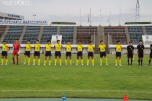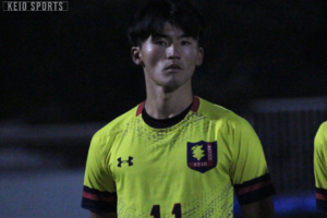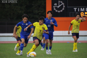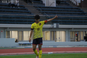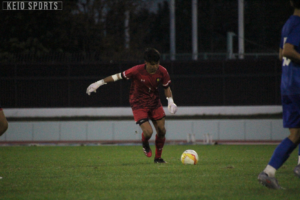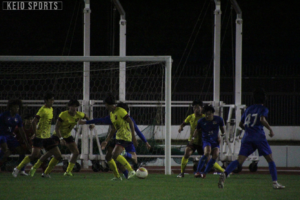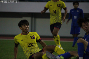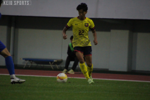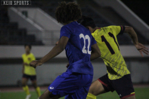 勢いづいた慶大は前半終了間際、カウンターから決定機を迎え最後は山本凉(法1・桐蔭学園)がグラウンダーのシュートを放つもわずかにゴールの外側へ外れてしまい2点目をあげることができない。この流れのまま追加点を奪いたかったが相手の守備を崩しきれず、1−0でハーフタイムを迎えた。