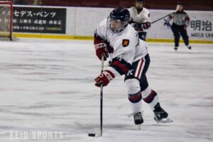 第1ピリオドは序盤から両チームの激しいパックの奪い合いが見られた。攻防戦が続くように思われたが、開始5分で試合が動く。FW・栖原大河(経3・慶應)による鋭いシュートでこの試合初得点を挙げる。