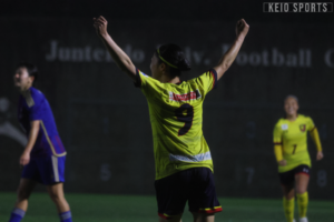 そして、25年の野村の活躍を語る上で外せないのが、昇格への大一番、後期第6節の順天堂大学戦だ。悲願の昇格達成に向け、敗北は許されない慶大。2―0とリードしながら後半に追い付かれてしまう重苦しい展開だったが、87分、一瞬の隙を突いて裏に抜け出した野村は、キーパーを冷静にかわして左足のシュート。これがネットを揺らし、勝ち越しに成功する。野村の値千金弾で取った1点のリードを守り抜き、慶大は勝ち点3を獲得。ここぞの場面で決める“背番号9”に相応しい活躍で、勝利に貢献した。