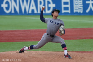 その時は、相手の3番バッターに中野(竣介=法2・桐蔭学園)さんという高校の先輩がいて、その人と対戦したいと思ってて、実際に対戦して抑えることができました。キャッチャーの加藤右悟(環1・慶應)と「最後一緒になって抱きつこう」という風に言っていたので、そこで良い結果を出せたのですごく嬉しかったです。