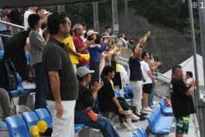 急いで保護者全員にこれを伝え、ベンチ裏に移動し、「全力応援しよう!」と皆で話しました。屋根のあるスタンドだったのですが、大きな声を出して応援すると、音が跳ね返り、拍手の音も鳴り響きます。天王山決戦だったこともあり、試合開始前の円陣の時から大きな声で応援していたのですが、いいプレーが出るたびに拍手と歓声で慶應サイドが沸き、特に、芽衣(=髙松芽衣、環2・植草学園大学附/ジェフユナイテッド市原・千葉レディースU18)の2得点の直後は大喝采で、選手たちからも「今日の試合は慶應のホームでやっているみたいだった」と言われました(笑)。直前の試合で恭佳(=岡田恭佳、環3・十文字)のけがもあったのですが、保護者席の横で一緒に応援してくれており、試合前は、選手たちが恭佳の3番のユニフォームを高々と掲げてくれました。