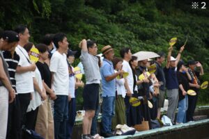 はい!まずは4年生の保護者で一体となって作ったうちわです。特にここ最近の気温上昇で、夏の試合では選手も大変な状況にありますが、応援の保護者達も勝負の一翼を担っているので、猛暑の中でも精一杯応援できるよう、仰いで使うこともできるうちわを作成することにしました。ホームではサイドライン際で応援するので、選手と区別できるようシャツは黄色を控えているのですが、少しでもチームカラーで客席を彩れたらと思い、黄色のうちわにしました。