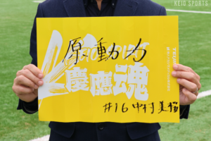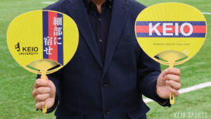 『細部に宿せ』というのは今年のチームスローガンで、「細かいところまで徹底してこだわっていこう」という想いが込められています。私たちも色やロゴにこだわり、慶應の”応援魂”を宿すべく、選手のシュートシーンの写真を切り抜いて黒抜きしてデザインに入れるなど、工夫して作りました。ちなみにこの黒抜き選手は、保護者や選手からは「誰かわからない」との回答が多かったのですが、黄監督はうちわを見た瞬間に選手名を当てており、細部の観察力がすごいと思いました(笑)。