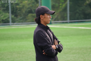 国士舘は、慶應が目指している1部で昨年まで戦っていたチームであり、フィジカルが強く得点力もある強敵です。勝利を祈願しながら町田のグラウンドに行ったところ、黄監督から「今日は総力戦で戦いたい。保護者の皆さんも一体となってほしいので、ベンチの裏に結集して、ぜひ力強い応援をお願いしたい。」という話がありました。