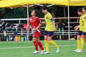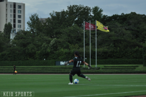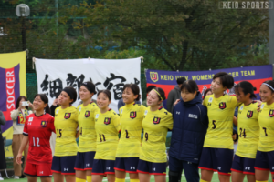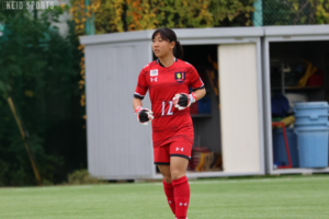 チーム唯一のキーパーの美桜選手。今季は離脱なく全試合フル出場を続け、最終節もスタメン出場となった。試合は前半から慶大がボールを握る中、フィールド経験を活かした正確なビルドアップで、11人目のフィールドプレイヤーとしても貢献していく。
