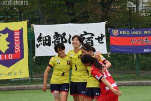 大量リードで迎えた後半、ついにタイムアップのホイッスルが。先輩たちから受け継いだ1部昇格の目標を実現させた。美桜選手は、共にゴールを守ってきた同期のCB・小熊藤子(環4・山脇学園/スフィーダ世田谷ユース、RB大宮アルディージャWOMEN内定)選手と抱き合うと、歓喜の輪に加わり、笑顔を見せた。