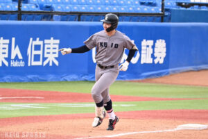 みんな祝福してくれたんですけど、高校時代はホームランを打ったら、横浜DeNAベイスターズがやっている「デスターシャ」というのをみんなでやるノリがあって、大学ではなかったんですけど、僕が打ったら「やっちゃう?やっちゃう?」みたいな感じになって、安達(英輝=商2・慶應)が実際にやって、盛り上げてくれたと思います。