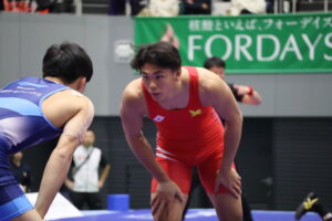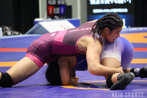 初戦は相手の棄権で不戦勝。続く準決勝の相手は、25年世界選手権59㌔級の王者・尾西桜(日本体育大学)。開始早々、タックルから足を取られるも、ポイントは与えずにしのぐ。その後パッシブから先制されたが、第1ピリオド終盤に2点を取り、2―1で折り返す。