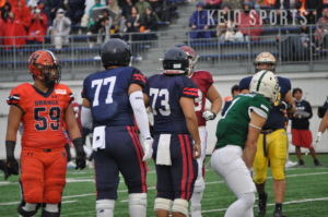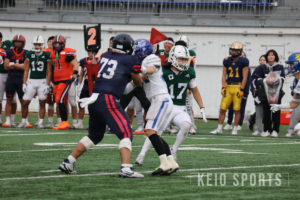 後半はTEAM SOUTHのオフェンスから再開したが、直後にファンブルを喫し、ターンオーバーを許す。続くディフェンスでは、慶大の天野、山田、作田が同時にフィールドに立つ布陣が実現。直後TEAM NORTHは地道に前進し、敵陣15ヤード付近まで攻め込むが、負けじとTEAM SOUTHディフェンスが気迫のフィールドゴールブロックに成功する。流れを引き寄せたTEAM SOUTHは、その後の攻撃でロングパスを通し、一気に前進。タッチダウンを奪って14ー21とし、最終Qを迎えた。