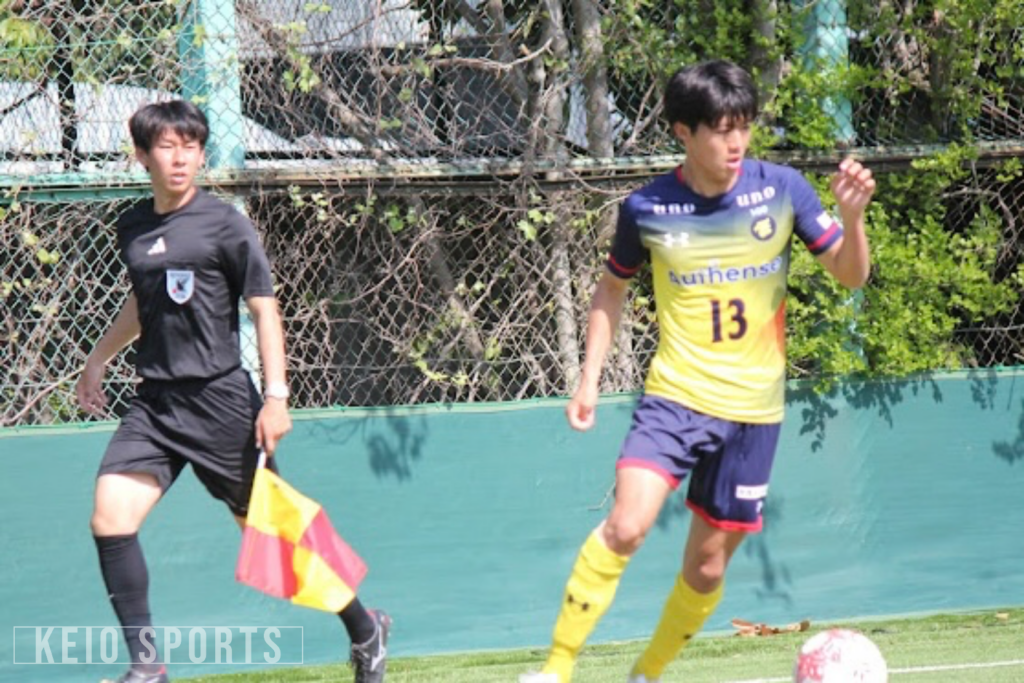 対する慶大は9分、右サイドで相手ボールを回収、そしてディフェンスラインの巧みなプレス回避から左サイドバックの霜田晟那(理2・都立八王子東/FC町田ゼルビアユース)へ展開。霜田からパスを受けた梅野真生(総3・成蹊高/横河武蔵野FC U-18)は中へクロスを送るも、ここはわずかにオノノジュ慶吏(政2・前橋育英)には合わない。