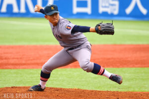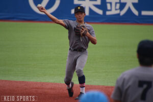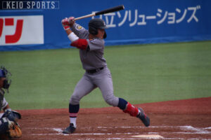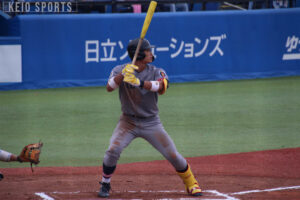 このままでは終われない9回の攻め、先頭は途中出場の渡辺憩(商2・慶應)。カウント1ストライクから完璧に捉えると、打球は左翼ポール際に飛び込む本塁打となり、1点を返す。しかし、大学日本代表候補にも選出された渡辺向の繊細な投球に翻弄(ほんろう)され、後続が凡退して試合終了。3対6で敗れた。