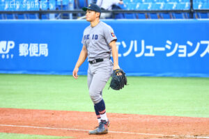 4回表は竹田一の安打などで作った追加点のチャンスを逃し、1対0で迎えた裏の守り。連打と四球で無死満塁の大ピンチを背負う。渡辺和は5番・荒井慶斗(文Ⅲ2・宇都宮)を膝下へのスライダーで空振り三振に仕留めるも、次打者・青貝尚柾(教4・攻玉社)に死球を与え、押し出しで失点。1対1と追い付かれる。なんとか同点で留めたいところだったが、7番・明石に右翼手の頭を越える走者一掃の適時二塁打を放たれ、1対4。勝ち越しを許すと、打者走者・明石には送球間に三塁まで到達され、なおも1死三塁とピンチが続く。続く松本慎は内野ゴロに打ち取るも、明石が生還してこの回5点目。ビッグイニングを作られ、大きなリードを許す。