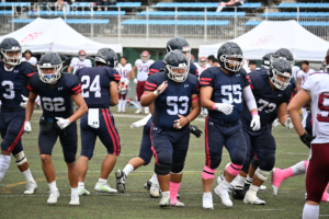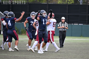 開幕3連敗で迎えたこの日。開幕初勝利を掴みたい慶大は、桜美林大学に対して前半からプレッシャーをかけ続けるも得点に至らない。しかし第2QにはWR・黒木哲平(経4・大宮開成)がタッチダウンを決め、念願の先制点を奪取。慶大の攻撃はここで止まらない。WR・田村遼(法4・慶應)へのミドルパスで敵陣深くに侵入すると、再び黒木がショートパスをがっちり掴み、この日2つ目のタッチダウンを決める。第4Qに桜美林大にタッチダウンを許すも、タッチダウン後に行われるTFPで相手のキックをブロックするなど、要所での好守が光った。試合は17-6と快勝。慶大が開幕初勝利を掴んだ。