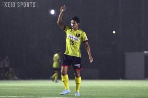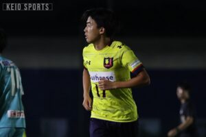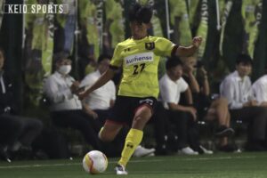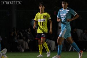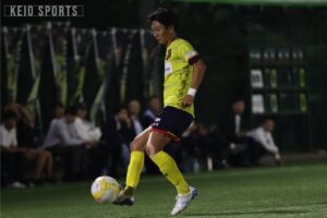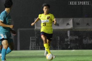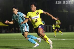 なんとか追いつきたい慶大だったが、45分に試練が訪れる。自陣の守備で大下が負傷し、三浦成貴(商3・浜松開誠館)が投入された。三浦成は総理大臣杯以来1か月ぶりのCBとしての出場となった。そのまま前半はタイムアップとなり、善戦しながらビハインドで試合を折り返した。前半を1点ビハインドで折り返し、なんとか同点に追いつきたい慶大だが、相手にボールを握られる時間が続く。そんな中、52分、ボックス内で角田からのパスを受けた齋藤真がシュート。相手DFにブロックされたこぼれ球にすぐさま反応し、再びシュートを放つも、ボールは枠を大きく外れバーの上を越えてしまう。