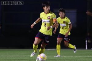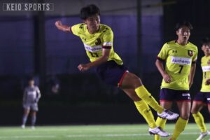 慶大最初のチャンスは4分。スタメンに抜擢された村井、霜田のコンビネーションで敵陣に迫りコーナーキックを獲得すると、ショートコーナーでサインプレーを発動。ペナルティーエリアの外から村井がファーサイドに巻くシュートを放つが、これはわずかに右に逸れ、先制点を挙げることはできない。