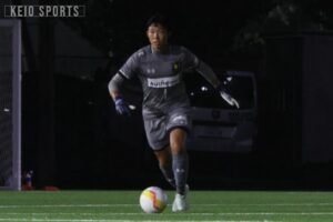 それでもゴール前では高い集中力を発揮し、無失点のまま時間が経過すると、徐々に慶大がペースを取り戻していく。32分、中盤でボールを回収してビルドアップを開始すると、素早いパスワークで筑波大のスライドが間に合わないうちに左WG齋藤真之介(経4・桜修館/FC 町田ゼルビアユース)までボールを回す。齋藤真が相手と正対し、サポートに回った左SB永澤昂大(政4・國學院久我山)へパスを出すと、永澤がボランチ田中のワンツーからミドルシュートを放つ。しかしこれは相手GKの正面に飛ぶ。
