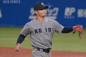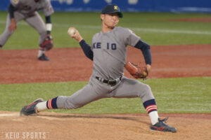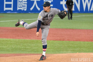 7回裏からは水野が登板する。水野は2つの三振を奪うなど安定した投球をみせて、相手に流れを与えない。6回、7回と小畠の前に三者凡退に抑えられた慶大打線は8回表、代わった吉野蓮(コミュ4・仙台育英)にも三者凡退に抑えられ、拮抗した展開が続く。8回裏も水野は三者凡退に抑える好投を披露。
