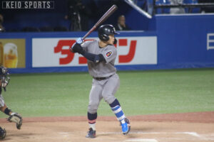 水野の投球で流れに乗った打線は9回表、先頭の4番・中塚遥翔(環2・智辯和歌山)が右前安打を放ち、出塁する。ここで代走に丸田湊斗(法2・慶應)が起用され、森村の打席で見事盗塁に成功し、監督の起用に応える。さらに、相手の暴投もうまれ、無死三塁の大チャンスをつくる。しかし、森村は遊ゴロに抑えられ、1死三塁。チャンスがつづくも6番・竹田一が遊ゴロを放ち、本塁タッチアウト。7番・八木も三振に倒れ、最大の好機を逃してしまう。