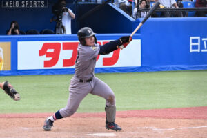 両チームの投手陣が好投を見せる緊迫した展開の中、絶対に落とせない一戦を粘り強く勝ち切った慶大。今季初めてのカード先勝となり、2つ目の勝ち点獲得へ向けて最高のスタートを切った。この日は、主砲・常松広太郎(政4・慶應湘南藤沢)がベンチ外。さらに5得点を挙げた11回は、今季チームトップタイの2本塁打を放っている渡辺憩(商2・慶應)・中塚がすでに途中交代していた。それでも一気に5得点を挙げることができたのは、一人一人がつないできた“全員野球”の執念が生んだものだろう。この勢いを次戦にもつなげ、連勝での勝ち点奪取に期待したい。