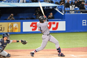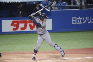 10回表、立大は投手が交代し、田中優飛(文2・仙台育英)が登板する。何がなんでも点を取りたい打線は、代わった田中の前に三者凡退に抑えられ、追加点がなかなか取れない厳しい状況がつづく。