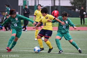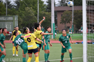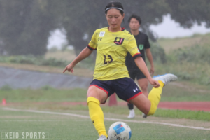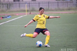 試合は序盤から慶大のペースで進む。19分、CKから守部葵(環4・十文字)がゴールネットを揺らすも、惜しくもオフサイドの判定。その後もゲームを支配し、前半だけで11本のシュートを放ったが、いずれも得点には結び付かずに試合を折り返す。後半は開始から2枚代えで攻勢を強めたが、上武大も集中力を切らさずに守り続け、スコアレスでアディショナルタイムに突入する。95分、森原日胡(総1・作陽学園)がクロスに合わせ、待望の先制点かに思われたが、これもオフサイド。ほとんどの時間でボールを保持し、26本のシュートを放ちながらも、相手の堅守を前にゴールを奪うことは出来ず、引き分けに終わった。