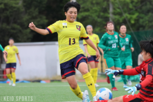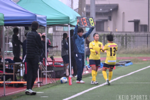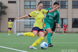 後半開始から、慶大は2枚代えを敢行。岩田に代え、右WBに森原日胡(総1・作陽学園)を。宮嶋に代え、シャドウやWBなど攻撃的ポジションでの活躍も光る田中紗莉(総2・市ヶ尾/日体大SMG横浜U18)を左CBに投入し、攻勢を強める。