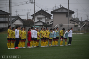 慶大はいつも通りの3−4−2−1システムながら、前節からスタメンを2人変更。鋭い縦パスとテクニックで魅せる副将・守部葵(環4・十文字)が4試合ぶりに先発に名を連ね、ボランチのポジション。また、1年生ながら攻撃の中心となっている山田葵(総1・聖和学園)が右シャドウでスタートから出場する。