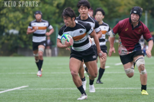 早大の勢いに終止符を打ちたい慶大は前半35分、山本がディフェンスの間をすり抜け、キックダミーやパスダミーを駆使して相手を巧みに翻弄し、内側からサポートに来ていたSH森がトライを決め切り、今試合チーム初得点を挙げた。