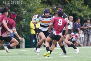 そこから勢いに乗った慶大は相手のラインアウトからボールを奪い、アタックを展開し、WTB安西が持ち前のステップで大きくゲインするなど、徐々にアタックの流れをつくるもトライにはつながらず、5-33で試合を折り返した。