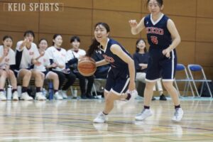 第1Q、河村さくら(文4・松陽)が試合開始約5秒で早々にレイアップを沈め、幸先よくスコアボードを動かす。続いて中山璃音(文4・湘南)がゴール下で確実に得点すると、再び河村も鋭いドライブで追加点を奪うなど、立ち上がりからテンポの良いオフェンスを展開した。中盤には中山が3ポイントシュートを沈め、チームの勢いをさらに押し上げる。さらに河村のレイアップ、今井楓子(商4・吉祥女子)のインサイドも続き、慶大の多彩な攻撃が止まらない。守備でも寄りの早さとリバウンドの粘りが機能し、相手を苦しめた。終盤には榎本京佳(経2・慶應女子)がジャンプシュートと3ポイントシュートを連続で沈めるビッグプレーで一気に流れを引き寄せ、29−6と大きくリードし第1Qを終えた。