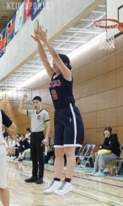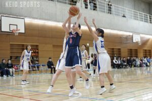 第2Qは、榎本のフリースローからスタート。続いて岡部愛(薬3・仙台二)が左サイドから3ポイントシュートを沈め、慶大が主導権をキープする。さらに網野梨加(環4・Irvine High)もインサイドで連続得点し、オフェンスの勢いは止まらない。ディフェンス面でも、東大の攻撃に対して強度を落とさずプレッシャーをかけ続け、簡単なシュートを許さない。中盤には小川佳凛(商1・長崎西)のミドルなど、チーム全体で流れをつかみながらスコアを伸ばし、60点台に突入する。終盤には榎本が再びレイアップとジャンプシュートで加点し、攻守ともに高い集中力を維持。東大も意地を見せるが、慶大の攻撃の厚みと精度は揺るがず、68−17と大差をつけて前半を折り返した。