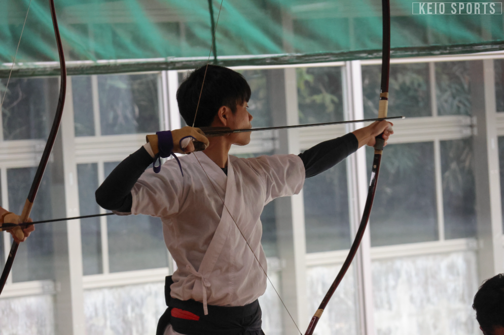 2戦目の相手は、都学Ⅰ部リーグの的中率上位者から成る都学選抜。小泉達也(政2・慶應)が1戦目に続き、全ての射で的中。大学から弓道を始めた八尋泰司(経2・開成)や主将の森住俊祐(経4・慶應湘南藤沢)も高い的中率を記録し、28㍍先にある直径わずか36㌢の的を次々と射貫いていったが、精鋭揃いの相手に敗れた。