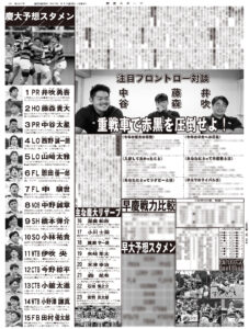 5面は両校のスタメン予想や戦力比較、選手アンケートの回答など、蹴球部を語る上で欠かせないポイントが詰まっております。また、明大戦でスタメン出場した井吹勇吾(環2・桐蔭学園)、藤森貴大(経3・慶應)、中谷太星(環2・東福岡)のフロントロー対談も掲載しております。