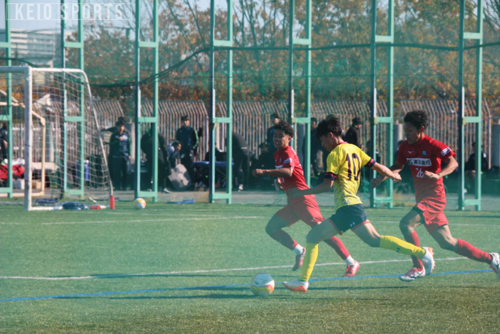 10人での戦いを強いられることになった。しかし直後の45+2分、自陣右サイドでの攻防の中で相手選手が慶大選手へ足裏を見せたタックルを仕掛ける。これが危険なプレーと判断されレッドカードとなり、10人対10人の戦いになった。前半はこのまま0-0で終了した。決勝T進出へいち早く得点を奪いたい慶大はHTに居郷元(経2・慶應)、朝井恒介(商2・慶應)、山内に代えて梅野真生(総2・成蹊/横河武蔵野FC U–18)、秋元心太(法2・駒大高)、三浦大其(経2・慶應)を投入。攻守両面で活性化を図る。