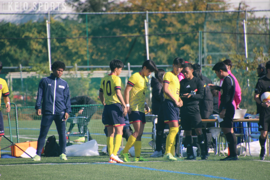 試合開始から積極的に仕掛ける慶大は5分、山内颯馬(総2・慶應NY)か高い位置でカットし一気にゴール前へと迫る。中央へドリブルで仕掛け横パスを出すも相手GKが飛び出してきておりシュートまで持ち込めない。その後ボールは握るものの決定機を作り出すことができず、そのまま時間が経過していく。そんな中、高い位置でのビルドアップのミスからGK福井大次郎(経2・慶應/横浜F・マリノスユース)が相手選手を倒してしまい、これが決定的得点機会の阻止(DOGSO)と判断され、レッドカード。GKが退場してしまった慶大は洪に代えて山本健翔(政1・川崎市立橘高 / 川崎フロンターレU-18)を投入。