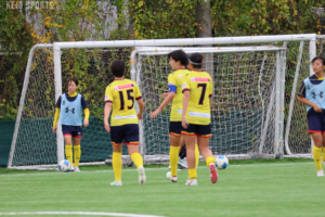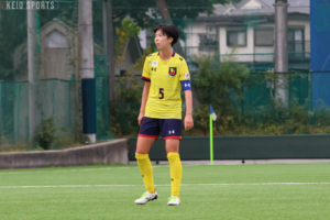 藤子選手はいつも通り、3バックの中央でスタメン出場。序盤から素早いグラウンダーのパスと、得意のフィードでビルドアップの起点となる。守備の局面でも、右の米口和花(総2・十文字)選手、左の宮嶋ひかり(環2・芝浦工業大学柏/ジェフユナイテッド市原・千葉レディースU18)選手の2人の後輩との抜群の連携で守っていく。