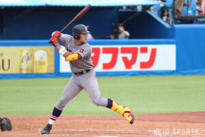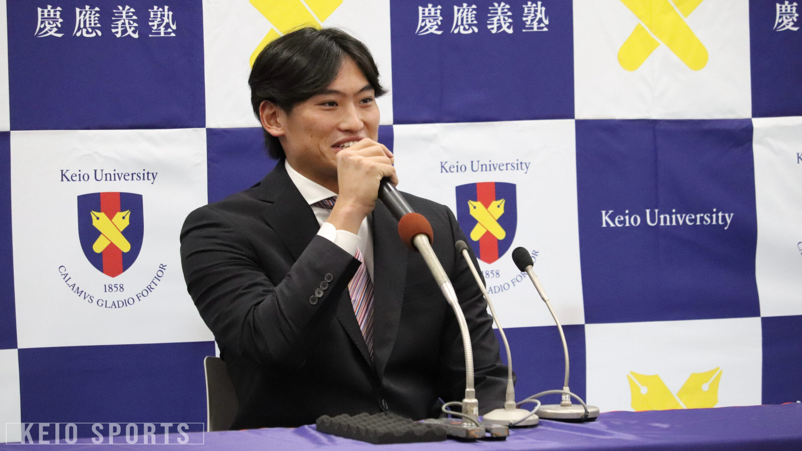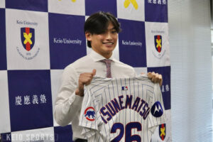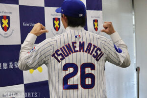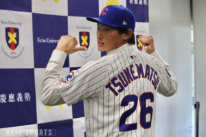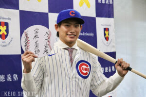 「常松広太郎によるシカゴ・カブスとのマイナー契約に関する記者会見」が1月19日、慶應義塾大学日吉キャンパスにて行われた。常松広太郎(政4・慶應湘南藤沢)は、昨秋のNPBドラフトで指名漏れを経験。その後、慶大野球部が公表した「卒業生進路先」には、米金融業界大手・ゴールドマン・サックスの名が記されていた。こうした中、シカゴ・カブスからのオファーを受け、日本時間1月16日マイナー契約を締結した。大学野球では3年春にリーグ戦初出場を果たし、2025年春季リーグ戦・立大2回戦では1試合2本塁打を記録。豪快なバッティングフォームから放たれる打球で、神宮の観衆を魅了してきた。本稿では、今回行われた記者会見での常松選手の発言(一部抜粋)とともに、東京六大学リーグでの活躍を振り返る。