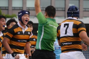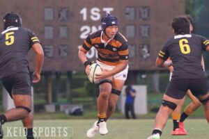 3月から蹴球部の練習に参加した山﨑は当初、周りとの差に圧倒されたという。しかし、ラグビーから離れたことで再発見したのは、自身のラグビーに対する感情だった。「3か月間ラグビーから離れたことで、改めてラグビーに対する愛が深まり、よりアグレッシブにラグビーを楽しめるようになりました」。楕円球への情熱にふたたび火をつけた山﨑は、猛練習を重ねて急成長を見せ、5月の春季交流大会・流通経済大学戦で〝初黒黄〟を飾ると、秋季対抗戦の初戦・青山学院大戦対抗戦デビューを果たすなど、1年目から目覚ましい活躍を見せた。