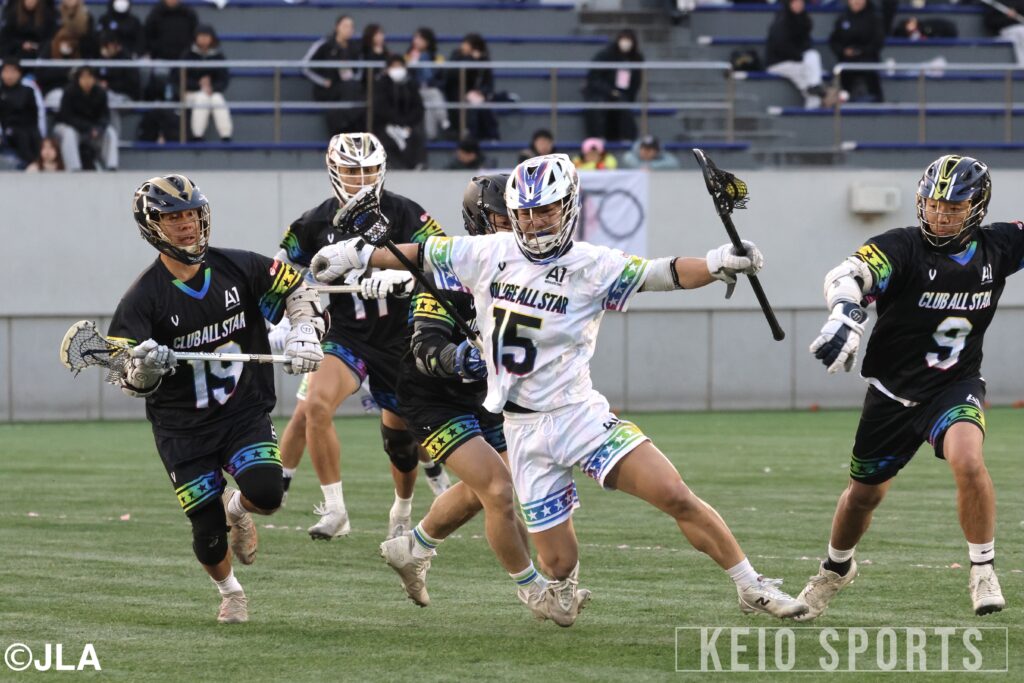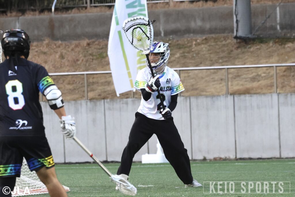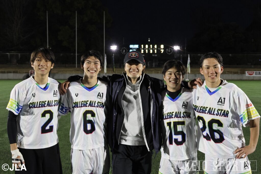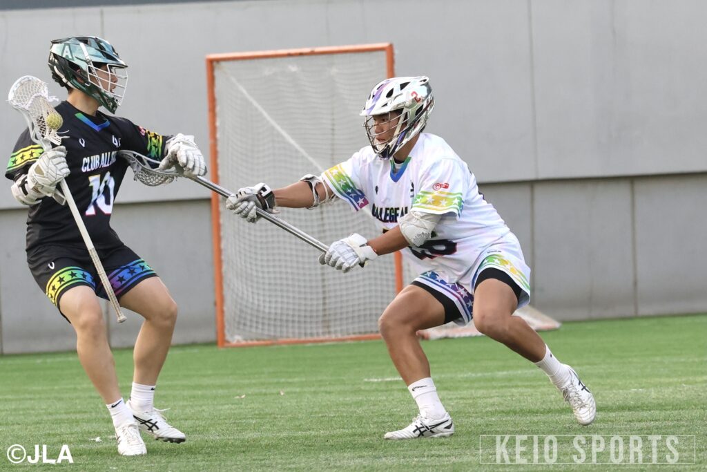 日本トップレベルの選手たちが集結するA1 ALL STAR GAME 2025に、慶大男子ラクロス部から4選手が出場。G・岩城敦大(法3・慶應)、MF・中西海(経4・海城)、前副将/FO・鈴木ケン春海(商4・慶應NY)、DMF・関志翔(政4・國學院久我山)が会場を盛り上げた。試合では、社会人チームが要所で強さを発揮。第3Q終了時点で、学生チームは2-6の4点ビハインドと苦しい展開に。後がない第4Q、ここで学生チームが意地のラクロスを展開する。積極的な攻撃が功を奏し、学生チームは立て続けに4点を追加。土壇場で6-6の同点に追いつくと、会場のボルテージは最高潮に。勢いを味方に逆転勝利を掴みたい学生チームでしたが、得点直後のFOからそのまま7点目を叩き込まれ、この1本が決勝点に。6ー7と僅かに及ばず、白熱のALL STAR GAME 2025は社会人チームの勝利で幕を閉じた。