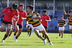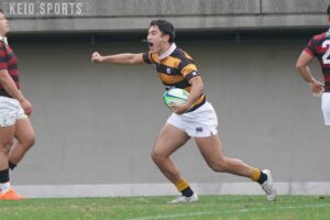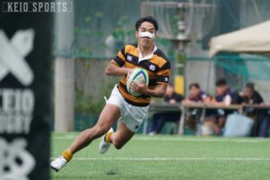 地元・栃木県内でラグビースクールのコーチを務めていた父親の影響で3歳からラグビーを始めた石垣。当時は「気づいたときにはラグビーに触れていた」、そんな感覚だったという。幼少期から“ラグビーが当たり前の日常”を過ごした石垣だが、高校進学時にはラグビーを続けようか真剣に考えていた時期もあった。そんな中慶應志木高に進学し、黒黄ジャージに袖を通すことを決意した。コロナ禍も経験した高校3年間は、全国高等学校ラグビーフットボール大会埼玉県予選において決勝に進むことすら叶わず、「花園は目指しても全く手が届かなかった場所。何度もラグビーをやっている意味を見失いかけた」と振り返る。一方で、何度も薄れたラグビー熱だったが高校卒業時には「もっと高いレベルでラグビーがしたい」気持ちへ変化した。こうして慶大蹴球部の門を叩いた。126代の慶應志木高出身者は石垣のみ。初めての寮生活で慣れない日常、そして高校時代に試合で打ち負かされてきた慶應高をはじめとするライバルたちとの生活に戸惑いを覚えつつも、個性豊かで気さくな126代の同期と共に楽しく部活動に励むことができたという。公式戦初出場は2年時の春季大会法大戦。同期の山本大悟(環4・常翔学園)や伊吹央(経4・慶應)と共にスタメンに名を連ね、勝利に貢献した。しかしその後は名だたる上級生のライバル相手にもがき、黒黄の11番の座からは少し遠ざかった。
