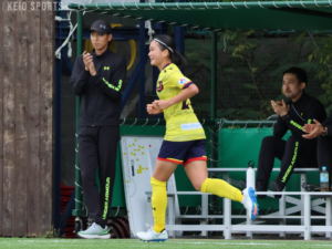3年目は、同期が相次いで故障し、戦線を離脱。チームも苦しむ中で、使命感はいっそう高まっていった。「ピッチに居るからには居続けないといけない」。ジムでのトレーニングやケアを見直し、練習にも試合にも、常に万全のコンディションで臨むように努めた。使命感の高まりは、性格の変化にも現れていた。「チームや同期で話し合いをするときも、間違っていることがあったら「それは違うんじゃない?」と言ってくれる」(中村美桜、理4・慶應湘南藤沢)。「ミーティングや2人で話すときに、しっかりと自分の意見を言ってくれる」(守部葵、環4・十文字)。下級生の頃は、自分の意見を主張することが得意でなかった坂口。学年を重ねるごとに組織の中での自らの役割を考えるようになり、想いや意見を積極的に伝えるようになっていった。「自分と全く違った視点で物事を考えられるし、言葉にできるので、すごく頼りにしていた」(小熊藤子、環4・山脇学園/スフィーダ世田谷ユース)。しかし、3年目のシーズンも昇格ならず。1年目から追い続けてきた目標は、最終年まで持ち越しとなった。