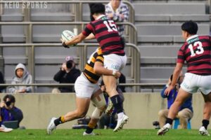 早大・矢崎由高(スポ3・桐蔭学園)に鋭いタックルを浴びせる伊吹