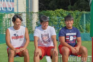 作田にとって、入替戦は同期の頼もしさを実感する試合でもあった。怪我で離脱していたエースで副将のWR・久保宙がなんとか復帰。主将の横手謙太朗(医4・慶應)と久保と作田の3人で試合挨拶にも参加できた。この試合の横手と久保のハドルが忘れられないという。横手の口から出た「俺を信じろ」という言葉。そして、苦しい時間帯に久保が「自分を信じろ」と仲間を鼓舞する姿。作田は「久保がボロボロの膝を抱えながら戻ってきてくれたのが大きかった。あの2人のハドルが試合を決めたものかなと思っている」と語っていた。